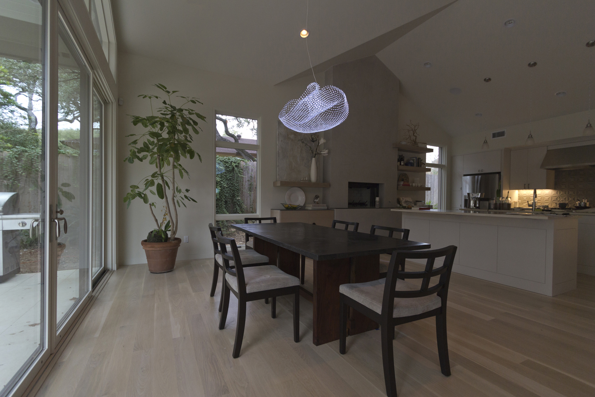 The piece is from the Organic Electric series. It can be placed on a surface (often with the power wires penetrating the surface to remain invisible) or hung as a chandelier. Sculptures are made to order and can be produced at varying sizes. They can be dimmed with a standard low-voltage dimmer and come with a brushed nickel ceiling canopy.