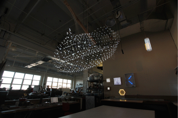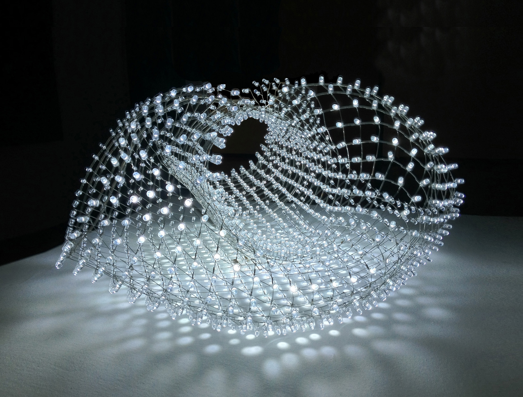 A sheet of LEDs rolled into a tube and connected together at its center. The top and bottom of the tube are folded backwards and fully attached to one another yielding the final form. The light sculpture is based on a 4-sided polygonal mesh. The mesh takes its mechanical and structural cues from the electrical requirements of the LEDs. Each requires two conductors to power it and two conductors supply the surrounding LEDs. The mesh can be used to create tubes and donuts but not spheres. The material cannot be folded or the uninsulated wires will touch one another and short.