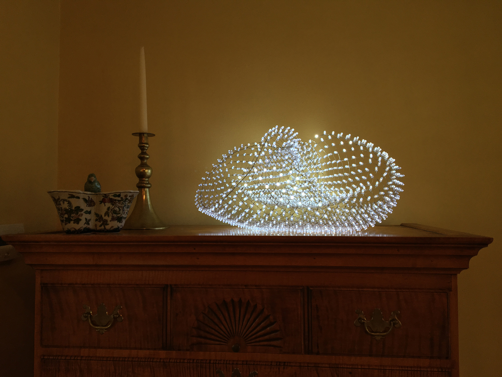 Function guides the form of this light sculpture. Each Basket light sculpture is handmade to suit a specific space. Krugman has been working with this form for over a decade, intrigued with its versatility at scale and its multiple axes of symmetry. Krugman originally created this shape as a table-top size light sculpture but quickly moved on to making centerpieces for dining rooms and foyers, and then eventually, brought the form to the building scale in 2019. See Krugman's Capella Basket for his largest of the series. Two ten-foot Basket sculptures are also installed at the Brooklyn Navy Yard's Building 77 and New Lab. Another ten-foot Basket is permanently installed at Baker Park in Naples Florida.